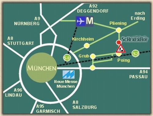 Wegen Straßenbauarbeiten kann die Pension-Schererhof ab Mai 2025 bis voraussichtlich Ende November, nur über die Staatsstraße von Pliening bzw. Gelting angefahren werden. Dazu verlassen Sie den Autobahnring München A99 an der Ausfahrt 15 (Kirchheim) in Richtung Erding.